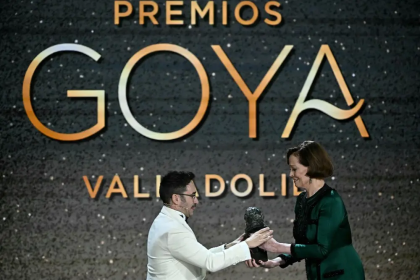 Fotografía: La actriz estadounidense Sigourney Weaver recibe de manos del director de cine español Juan Antonio Bayona el Premio Goya Internacional por su carrera en la 38ª ceremonia de los Premios Goya en Valladolid, el 10 de febrero de 2024 / Javier Soriano – AFP