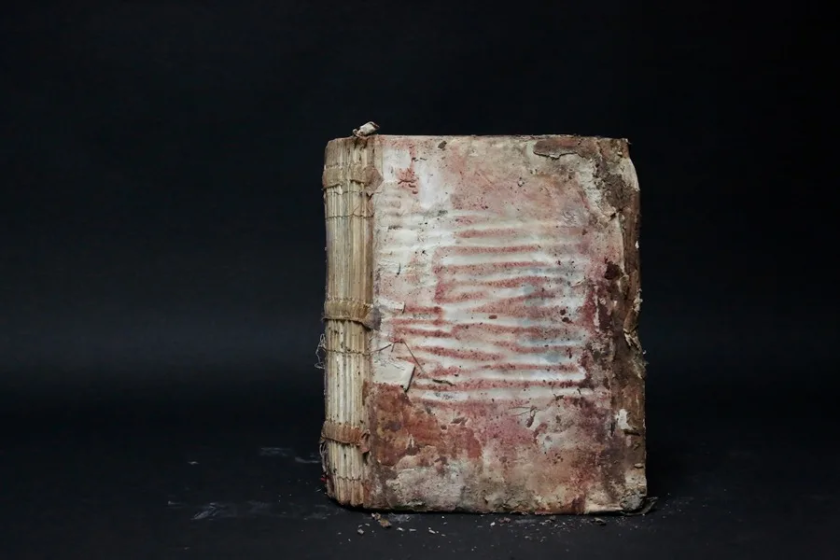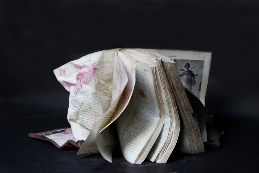 Y así se refleja en su obra: páginas entrelazadas que se ondulan como olas, cubiertas desgastadas e ilegibles, u hojas arrugadas y descoloridas.